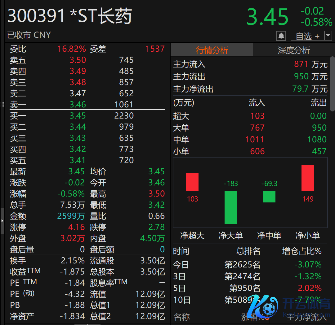 结束11月7日,*ST长药报3.45元/股,下落0.58%,总市值仅为12.09亿元。
