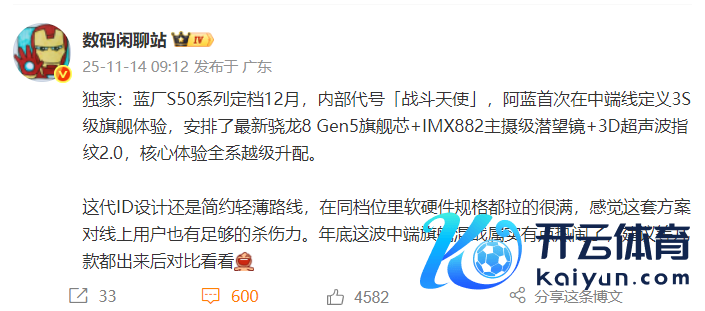 在此之前行业东说念主士“数码漫谈站”仍是给出了vivo S50系列的一些信息,他暗示vivo S50系列定在12月发布,里面代号“战争天神”。vivo初度在中端线界说3S级旗舰体验。安排了最新高通骁龙8 Gen5旗舰芯片+IMX882主摄潜望镜+3D超声波指纹2.0,中枢体验全系越级升配。外不雅ID诡计如故从简漂流阶梯,在同档位里软硬规格王人拉的很满。他嗅觉这套决策对线上用户也有富余杀伤力。这阐述vivo S50系列的参数成立越过亮眼,怪不得韩伯啸暗示要更正这一级别机型的游戏模范呢?