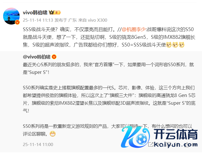 伴跟着OPPO Reno15系列定档,500系列开启预热,预示着新一轮国产中端线下机大战运转。这不vivo S50系列也运转预热了开云官网切尔西赞助商,与此前相似发轫由居品司剃头出一些信息,不外这一次居品司理堪称要更正游戏模范。