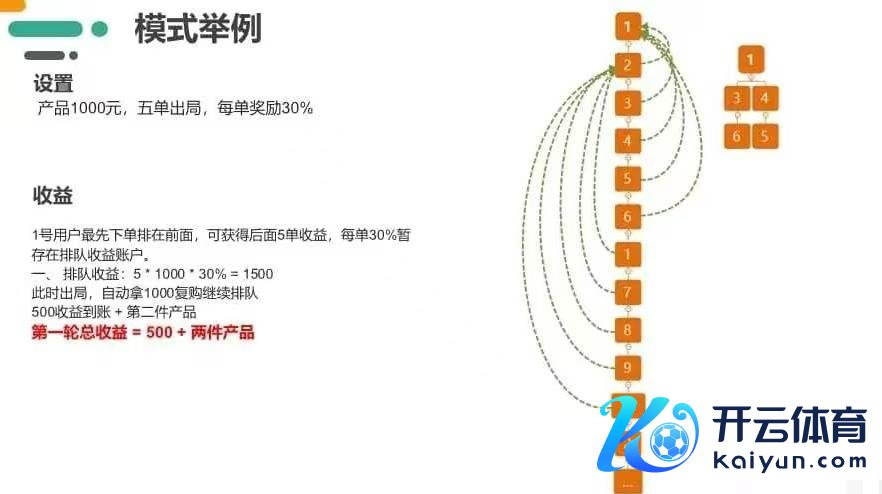 (一)奖励预备示例通过具体实例能更明晰地融会奖励机制。假定产物价钱为800,其中百分之35手脚排单奖励,选用五出一的设定。用户浮滥800插足列队,若处于1号位,后续有五个东谈主列队进来,1号位的用户就能取得百分之35×800×5 = 1400然后出局。