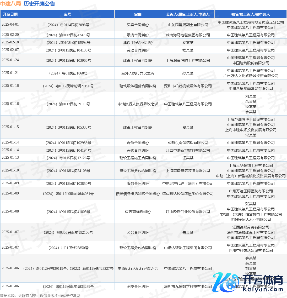 本站音书,笔据天眼查APP透露,近日公布了一则中国建筑第八工程局有限公司行为原告/上诉东说念主的开庭公告,详备本色如下: