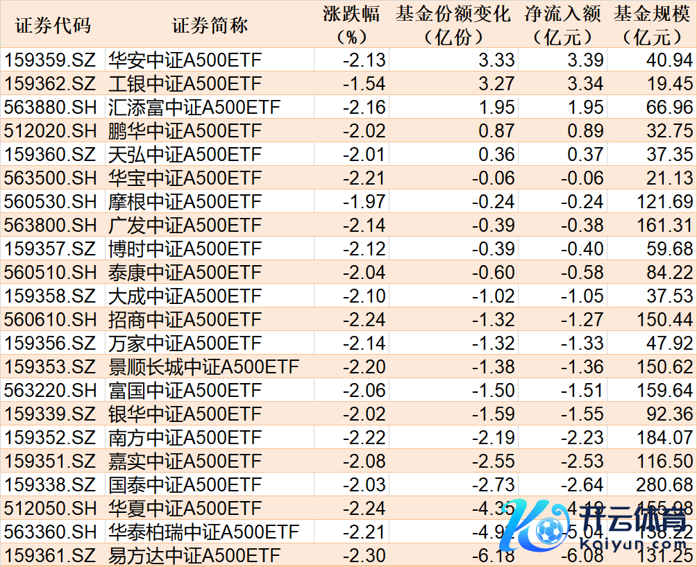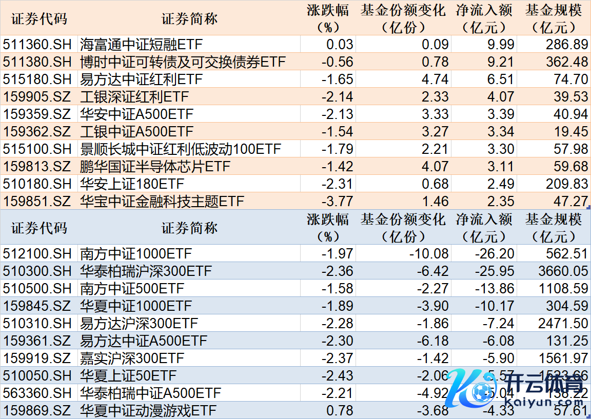 与此同期,南边中证1000ETF基金份额减少10.08亿份,净流出额为26.20亿元;华泰柏瑞沪深300ETF基金份额减少6.42亿份,净流出额为25.95亿元;南边中证500ETF基金份额减少2.27亿份,净流出额为13.86亿元。