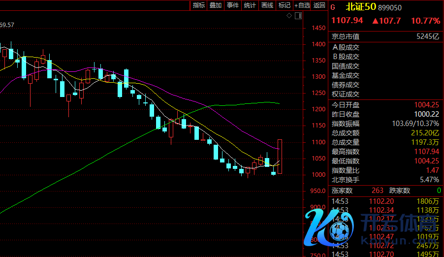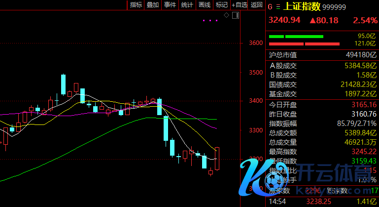 当天,A股迎来久违的大阳线,北证50指数放量飙升10.77%,创年内新高,成交较昨日猛增逾1倍,创业板指也大涨4.71%,复兴2000点,上证指数站上3200点,深证成指亦冲破万点大关。超5400只个股高潮,成交1.37万亿元,较昨日激增近4000亿元。