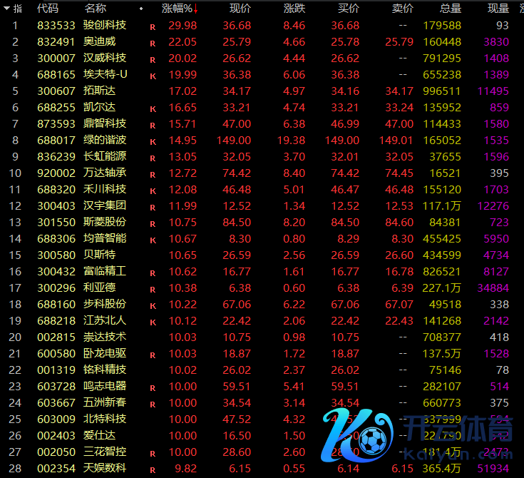 骏创科技30%涨停,汉威科技、埃夫出奇多股20%涨停,三花智控、江苏北东谈主等近30股也强势涨停或涨超10%。