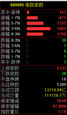 市集共5333只个股高潮,157只个股涨停,仅38只股票下降。