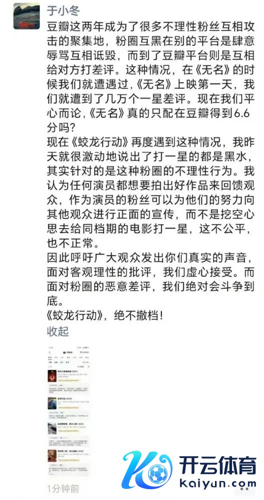 当天,于冬再次就此话题发声。他示意,豆瓣平台这两年景为好多不睬性粉丝相互抨击的连合地,“粉圈互黑在别的平台是大力口舌相互谩骂,而到了豆瓣平台则是相互给对方打差评。这种情况,在《无名》的技艺咱们就遭受过,《无名》上映第一天,咱们就遭到了几万个一星差评。当今咱们公私分明,《无名》确实只配在豆瓣取得6.6分吗?”