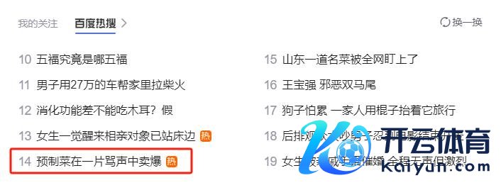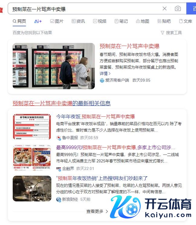 最近包涵了下百度热搜,发现一个很特根由的情景,在第12到14条的热搜,野蛮会出现废话。要是不信的一又友不错偶尔包涵一下,并作念个纪录云开体育,阐扬简略反驳一下。 今天的百度热搜上,一刹就蹦出来一条,“预制菜在一派骂声中卖爆”! 本以为,是不是在这个春节,东说念主们齐招揽预制菜了,不然如何能叫“卖到爆”呢? 看了几篇相干著作下来之后发现,除了蹭流量的,莫得哪一条新闻开始能阐扬“爆”这个点。 在百度热搜首页,上头列的四篇著作中,第一篇著作中找到相干的数据,主要有:某品牌淘宝官方旗舰店的预制菜礼盒销...
