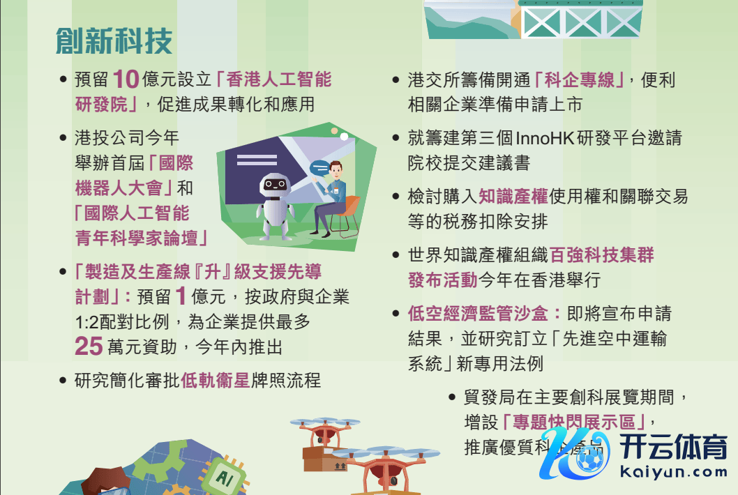 同期,特区政府将制订香港新式工业的中永恒发展决议,并通过100亿港元“创科产业指点基金”,加强指点商场资金投资策略性新兴和畴昔产业。此外,特区政府正磋磨推出1.8亿港元的“创科加速器先导操办”,政府会按1:2的配对比例,向每家专科初创企业服务机构提供最高3000万港元资助,通过其买卖网罗及告戒,丰富本港的初创生态圈。